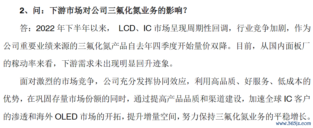 南大光电表示,2022年下半年以来,LCD、IC市场呈现周期性回调,行业竞争加剧,面对激烈的市场竞争,公司将“充分发挥协同效应”券商配资公司,利用“高品质、好服务、低成本的优势”,在巩固存量市场份额的同时,通过提高产品品质和渠道建设,加速全球IC客户的渗透和海外OLED市场的开拓,提升增量空间,努力保持三氟化氮业务的平稳增长。
