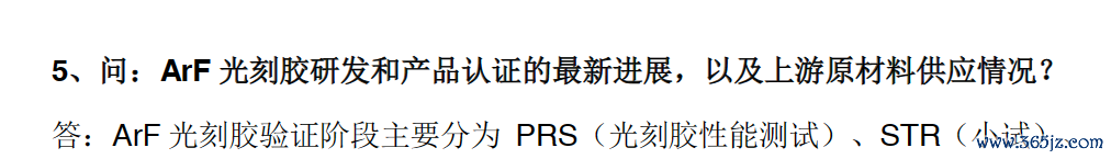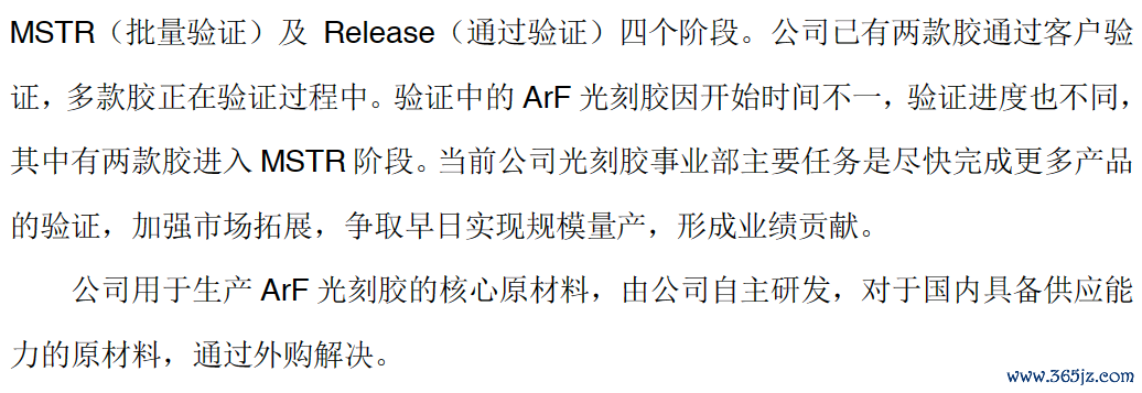 公司已有两款胶通过客户验证,多款胶正在验证过程中。验证中的ArF光刻胶因开始时间不一,验证进度也不同,其中有两款胶进入MSTR阶段。当前公司光刻胶事业部主要任务是尽快完成更多产品的验证,加强市场拓展,争取早日实现规模量产,形成业绩贡献。