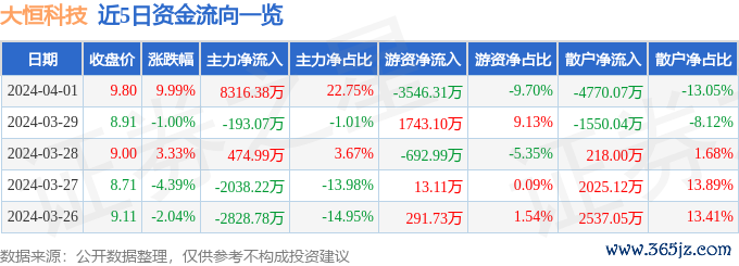 4月1日的资金流向数据方面,主力资金净流入8316.38万元,占总成交额22.75%,游资资金净流出3546.31万元,占总成交额9.7%,散户资金净流出4770.07万元,占总成交额13.05%。