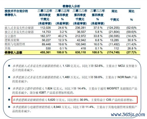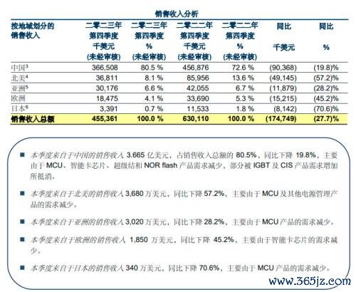 具体来看,2023年四季度,该公司来自于中国的销售收入3.665亿美元,占销售收入总额的80.5%,同比下降19.8%,主要由于MCU、智能卡芯片、超级结和NORflash产品需求减少,部分被IGBT及CIS产品需求增加所抵消。