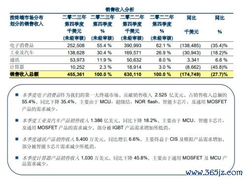 按终端市场分类,电子消费品作为其第一大终端市场,去年四季度贡献销售收入2.525亿美元,占销售收入总额的55.4%,同比下降35.4%,主要由于MCU、超级结、NORflash、智能卡芯片、及通用MOSFET产品的需求减少。