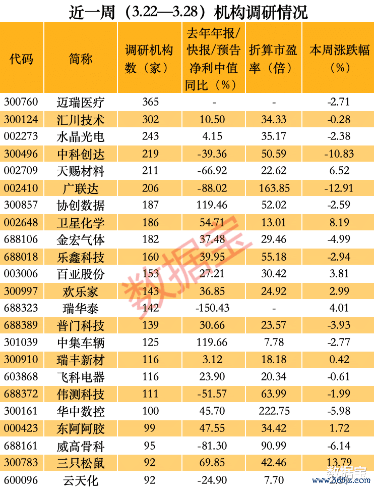 近一周机构调研个股数量有200多只,迈瑞医疗成为调研机构数量最多的股票。
