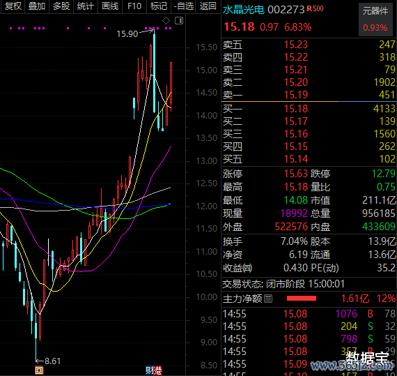 本轮反弹水晶光电股价表现亮眼,一度从9元下方涨至近期最高的15.9元。