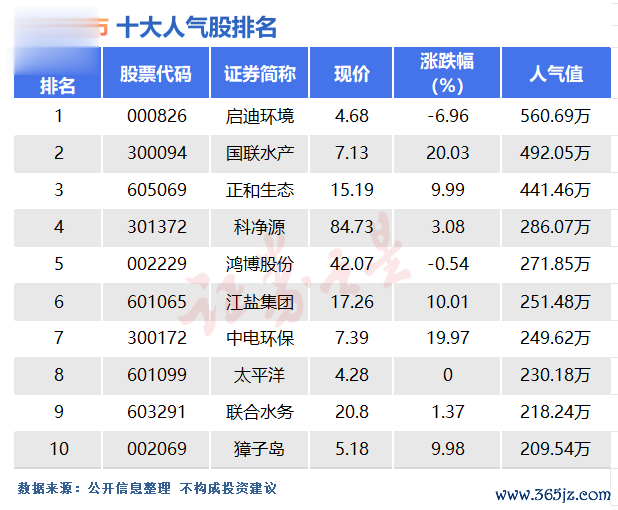 8月24日三大股指整体冲高回落,下跌家数略多于上涨家数,不过比较积极的一点是成交量又放大到了8000亿左右。盘面上环保、养殖板块表现较好,地产、煤炭、基建板块则是表现不佳。人气股方面广州股票配资,江盐集团、獐子岛等多股涨停,启迪环境则是唯一一支大幅下跌的个股。下面是今日十大人气股排名的详细情况。