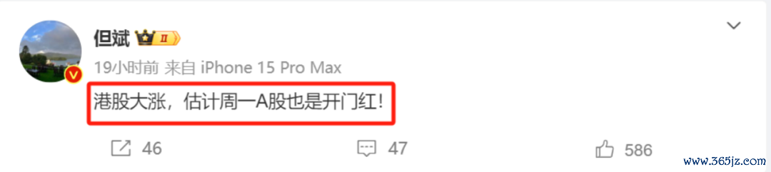 有观点认为,这很有可能会传导至A股,从而使得A股上演“开门红”行情。 如东方港湾董事长但斌指出,“港股大涨,估计周一A股也是开门红!”