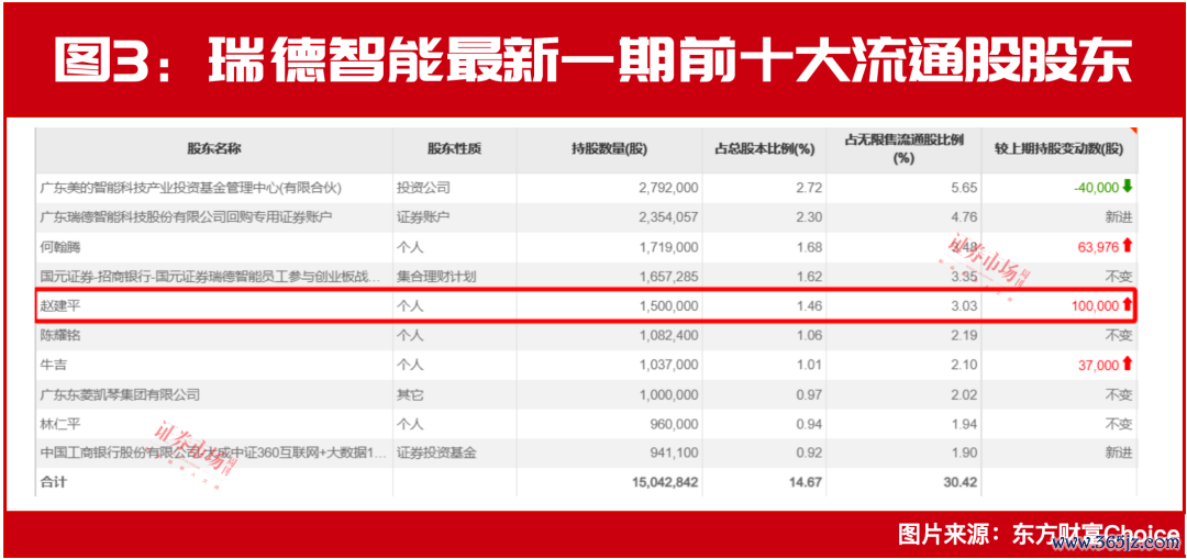 不过,赵建平在近期也进行了逆势加仓,加仓的这家公司仍是瑞德智能。瑞德智能截至2月7日的前十大流通股股东名单显示,赵建平再次现身其中,并且持股数量增加了10万股(见图3)。