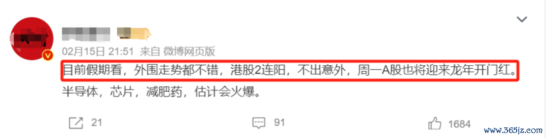这与多位财经大V“所见略同”。如某财经大V在2月15日表示,“目前假期看,外围走势都不错,港股2连阳,不出意外,周一A股也将迎来龙年开门红。”